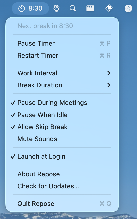 My eyes hurt when I stare at a screen for too long. There are a lot of break reminder apps out there, and a popular one, LookAway, costs $38. There are also free apps, but most of them are Electron apps (>80MB) or don’t have automatic meeting detection, which is a key requirement for me.
